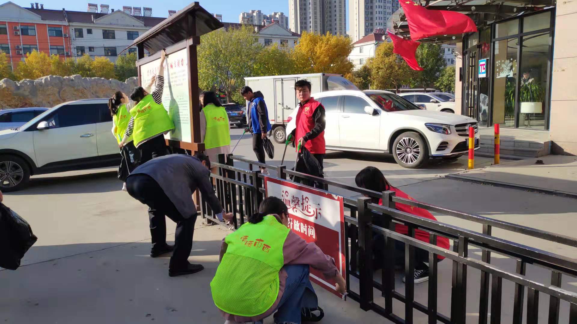 早上八点,bat365官网所有党员在大学创意文化城北门与社区工作人员会合并进行简单的分工后,大家便分头行动。有的同志负责清理垃圾,利用垃圾夹、扫帚等工具将路边散落的塑料袋、落叶、烟头等清理干净;有的同志负责擦拭广告牌、宣传栏;有的同志则负责将店铺门口、街道两旁的共享单车以及各店铺的私人单车摆放在专用停车位上。经过一个多小时的“战斗”,文化城面貌便焕然一新,经过细心清理后的路面显得更加干净宽敞,经过擦拭之后广告牌看上去更加干净、明亮,经过摆放后的电动车自行车看上去更加整齐。活动结束后,全体党员与社区工作人员合影留念,将志愿服务的风采定格在党旗飘扬和党徽闪耀的深秋清晨。