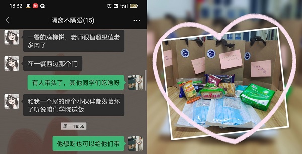 bat365官方网站针对隔离学生组建了志愿服务工作小队,采用“线上+线下”的方式为隔离学生送去温暖。辅导员老师们通过微信、视频、电话等形式,提前了解集中隔离学生的生活需求,将所需物资采购齐全,确保每位学生能在隔离期间保持营养健康,叮嘱大家要严格遵循集中隔离观察点的工作要求和操作流程,提高防范意识,做好个人防控,调整好心态,保持正常的作息规律,学院会一直并及时地解决同学们在生活上的困难和需求,进一步增强大家战“疫”必胜的信心与决心。