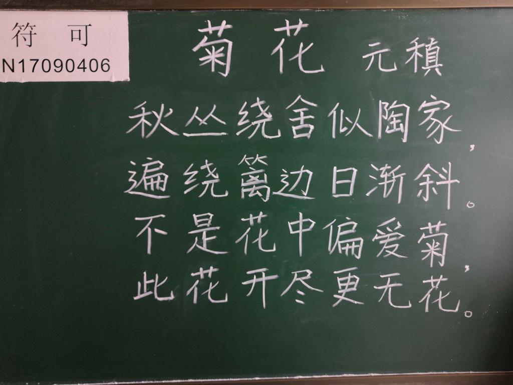 本次考核旨在“以考促练”,推动师范生自主开展粉笔字训练,从而提高学生粉笔字书写能力和板书设计能力。考核要求学生在规定的时间里,书写一首古诗。2017级师范学生在经过一年的勤学苦练后,粉笔字书写能力取得了长足的进步,面对这次考核他们信心满满。考核过程中,他们一个个下笔如有神,或端正大方、舒展有力,或形体美观、字体方正,或圆润、清秀……首首古诗在小黑板上跳跃而出,充分展现了万博体育师范生扎实的基本功。2017级英语专业廖同学在考核后说,“自从学校要求开始练习粉笔字后,我的写字功底得到了极大的提升,随之而来的自信心也增强了不少,在面对将来的各类比赛、就业挑战更加有信心了。”