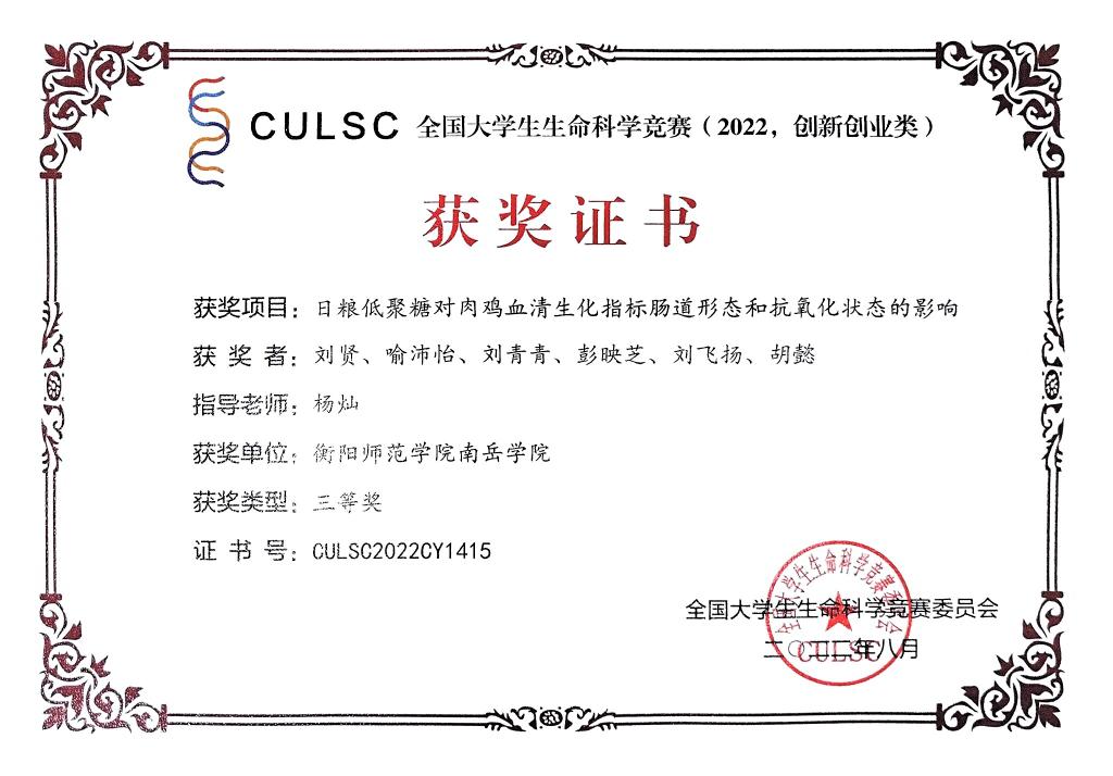 这一赛事采取以学生排名前三的文章或杂志进行比赛,针对学生的贡献度进行盲评,赛事为期一年。在竞赛过程中,项目组成员凭借扎实的功底、出色的科研素养,完成了科学研究试验,以刘贤为第一作者完成了英文论文的写作和投稿,文章发表在国际权威期刊Animal Science Journal (SCI三区)。