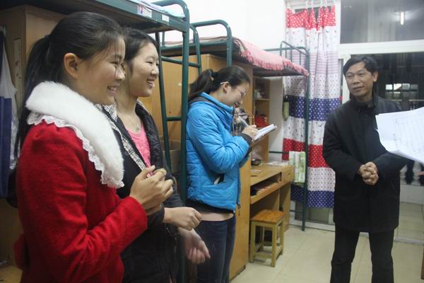 11月27日晚9点30,万博体育领导和全体辅导员老师分成五个小组,深入学生宿舍,主要目的是了解学生宿舍卫生情况,听取有关学院建设的意见和建议。每到一处,领导和老师们都细心询问学生宿舍环境卫生、热水供应、用电安全、学习和生活等情况,对发现的问题,当场解决或提出解决法办法。走访中,领导们督促同学们自觉保持卫生,激发宿舍成员的主动性,共同营造良好的生活环境;提醒同学们注意休息,保证有饱满的精神投入到紧张的学习中;叮嘱同学们要有安全防范意识,明确安全用电的重要性,严禁使用大功率电器。(文字/陈婷 摄影/周裕梦)