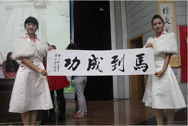 接着,他详细介绍了书法分为五指法、三指法、握拳法三种笔法,并亲自示范握笔方法,指导同学们规范书法。最后,曹中庆老师现场展示了书法作品,同时给同学们赠字并送上祝福。