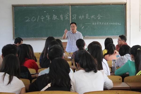 为加深毕业生对专业实习的认识,促进实习工作的顺利开展。9月24日下午,万博体育中文系2014年汉语言文学专业教育实习动员大会在综合楼101教室顺利召开。中文系主任朱光迪、副主任杨旭明、职业中专实习带队老师彭志耘、华岳中学实习带队老师阳建雄出席本次动员大会,汉语言文学专业2011级全体实习生参加大会。