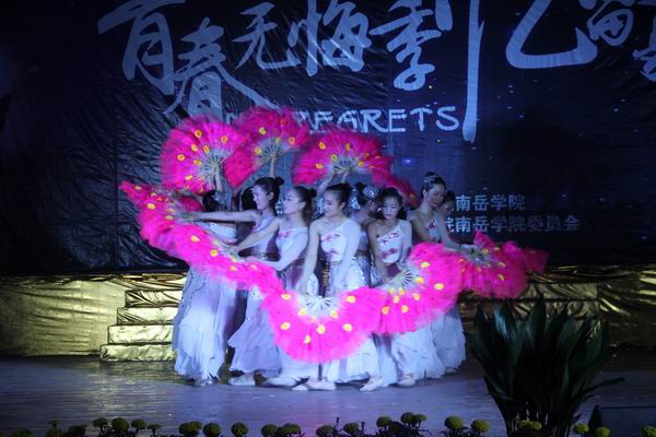 律动的节奏,激荡的音符,掌声响彻大厅,开场舞《OS queen》迅速拉开晚会帷幕。接踵而至的美声独唱《越走路越宽》,歌声唱不尽好山好水好时光,赋予毕业生幸福走向明天的美好希望;一组民族舞蹈串烧《我舞飞扬》,柔缓轻盈,展现了民族舞之魅力。回望尽头留下青春岁月,展望前方不尽,似水流年,温馨美好的合唱朗诵《毕业的季节》,勾起毕业生们对大学生活珍贵的回忆;而后,美术系表演者现场书写毛笔字对联“映山红边,桃李满目”,并将王群创作的花鸟国画赠予母校,院党总支书记高峰和院长邓双喜代表学院上台接受这份沉甸甸的厚礼。相声表演《幸福的味道》,以幽默风趣的语言,提醒大学生今后追求平平淡淡的幸福才是真谛;“梦回青青池畔,回忆灯火阑珊”,柔美飘逸的舞蹈《落花情》,给观众带来唯美的视觉享受;流水带走光阴的故事;劲爆歌曲《王妃》掀翻全场,歌曲串烧《光阴故事》,让他们始终记得最好的青春年华曾留在这里。
