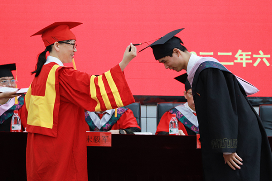 副院长宋毅军宣读《关于授予曹文宇等1008名2022届本科毕业学士学位的决定》,院长王芳宇为毕业生代表颁发毕业证书,院学位评定委员会主席李玲玲为获得学士学位的毕业生代表拨穗正冠,颁授学位。