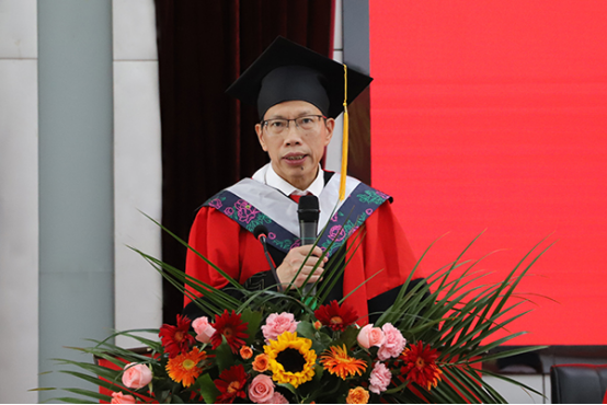 典礼的最后环节,院长王芳宇深情致辞。在回顾2022届毕业生勇克时艰、刻苦学习、取得斐然成绩之后,王院长以自己的亲身经历和毕业生们分享了三句话:一是“守住道德的底线”。他要求全体毕业生秉承先贤教诲,坚守职业道德,遵纪守法,争做时代楷模;二是“扬起理想的风帆”。王芳宇认为,理想属于仰望星空、谋划未来、成就事业的人。他寄语毕业生对自己、社会、时代多维度理性解读,聚焦目标,明辨人生方向。他坦言,一个有理想的人,人生可能有些辛苦,但没有理想的人,人生注定荒芜;三是“拒绝苟且的人生”。他希望全体毕业生不苟于现状,安心生活,用心工作,奋发图强,将平凡的事情做精做专乃至极致。最后,王芳宇希望同学们牢记“厚德、博学、励志、笃行”的箴言,践行“尚学向善,求实求真”的院训,崇尚道德,关爱他人,追随理想,做最好的自己!