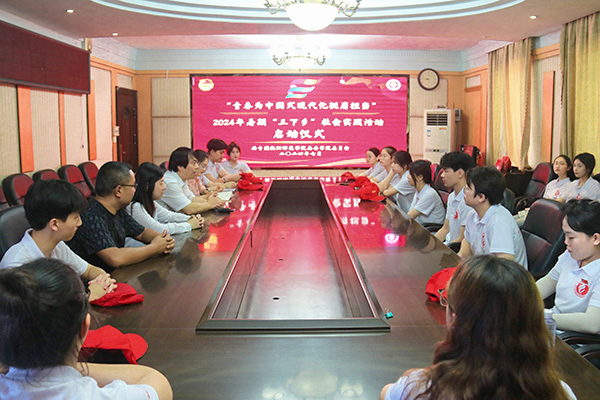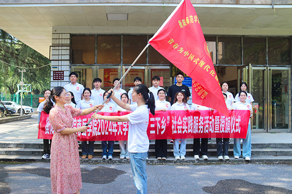 接着,南岳学院副院长蒋琛为本次活动致辞。他代表学院对即将参加社会实践的全体师生表示亲切的问候和良好的祝愿,呼吁青年要秉持奉献、友爱、互助、进步的理念,深入乡村、服务乡村、了解乡村,用自己的专业知识和技能为乡村振兴赋能,努力成为乡村振兴的参与者、实践者和推动者,把青春论文写在祖国大地上,用奋发有为的精神面貌谱写诗篇,并对参加暑期“三下乡”社会实践活动的全体成员提出四点希望:一是积极准备,做好安排。把握好工作进程,及时了解、掌握和解决活动中出现的问题,把各项工作真正落到实处,以饱满的热情和昂扬的斗志走向基层。二是学思践悟,学以致用。虚心向群众学习,用好所学知识,发挥专业优势,踊跃投身社会实践,向下扎根,向上生花。三是不畏艰苦,百折不挠。吃苦应该是新时代青年的一场必修课,在基层实践中将会遇到各种各样的考验,因此要发扬不畏艰苦、百折不挠的精神,脚踏实地、勇于开拓,在服务人民、奉献社会中提升自我、完善自我。四是严守纪律,确保安全,树立安全防范意识,加强交通安全、饮食安全和住宿安全等方面的安全防范,确保实践活动安全顺利开展。最后,团委书记范建华为社会实践服务团授旗。