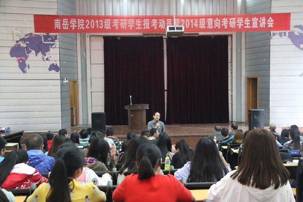 9月29日下午,南岳学院在西校区模拟法庭举行2013级考研学生报考动员暨2014级学生意向考研宣讲会。南岳学院党总支书记匡云山、院长王芳宇、党总支副书记周华、副院长宋毅军、蒋琛出席会议。物理与电子信息工程学院院长陈列尊、外国语学院院长贺学耘、法学院院长谭和平、文学院院长任美衡、美术学院院长叶经文、体育科学学院院长胡建忠、化学与材料科学学院院长许志锋、城市与旅游学院副院长邹君、数学与统计学院副院长李龙、教育科学学院副院长刘衔华和经济与管理学院邹建国博士也应邀出席此次会议。大会由南岳学院党总支副书记周华主持。