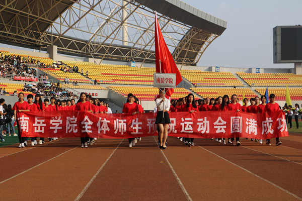 伴随着昂扬雄浑的运动员进行曲,校国旗队、彩旗队,及各学院方阵队等依次进入田径场。本届运动会共有二十五个方阵队,其中,由南岳学院72名学生代表、36名教师代表组成的第二十三号方阵队精神抖擞、意气风发,在南岳学院党总支书记高峰、院长邓双喜的带领下,迈着坚定的步伐,嘹亮地高呼着:“南岳南岳,追求卓越!齐心协力,共创佳绩!”这铿锵有力的口号,高昂磅礴的气势无不展示了南岳学院的精神面貌,将运动会开幕式推向了高潮。