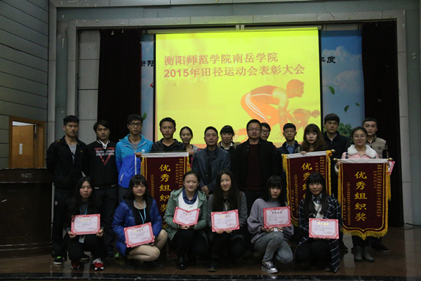 会议伊始,全体与会人员观看了运动会剪影视频,共同回顾了运动会期间的感动瞬间和精彩赛事,展示了南岳健儿们所取得的优异成绩。接着,学院党总支副书记林琼宣读了《关于表彰2015年大学生田径运动会先进集体和先进个人的决定》。经万博体育110余名参赛运动员的奋勇拼搏,学院获得了学生普通组男子团体第一名,普通组女子团体第一名,普通组男女团体第一名的好成绩,同时荣获“道德风尚奖”。其中,理科综合团总支、外语系团总支、教科与生科团总支荣获“优秀组织奖”,30名先进个人获得了“优秀运动员”、“优秀教练员”、“优秀工作人员”的荣誉称号。随后,与会领导为获奖集体及个人分别颁发锦旗、荣誉证书和奖品。