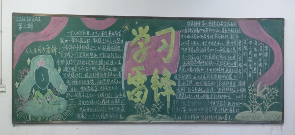 各班黑板报构思灵巧,黑板报文字内容有创新。将雷锋精神内化于心、外化于行,用雷锋精神激励全体学生爱党爱民。不但在黑板报作品的创作中提高了学生对雷锋故事的知晓度,而且营造了学习雷锋的浓厚氛围。让学雷锋在社会中特别是青年学生中蔚然成风,让学雷锋活动融入日常、化作经常。经过严格评审,最终2022级学前教育二班荣获一等奖,2022级汉语言文学二班、2022级汉语言文学五班荣获二等奖,2022级汉语言文学一班、2022级法学一班、2022级思想政治教育一班荣获三等奖。