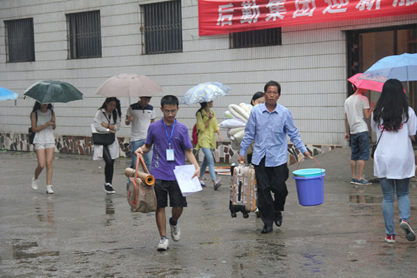 路途遥远,但不少新生仍在家长的陪同下早早来到迎新现场报到。学生家长们替孩子扛着重重的行李,孩子们替父母撑伞遮雨。新生报到处坐着一对夫妻,神情虽喜悦又透露着担忧。记者上前询问得知,是前来报到的吴同学的父母,吴爸爸说:“孩子从来没离开过身边,第一次自己独立生活,我们还是有点不放心,她从小独立能力就差,我希望她能尽快适应大学生活,多与老师同学沟通交流,有问题可以及时咨询老师。”