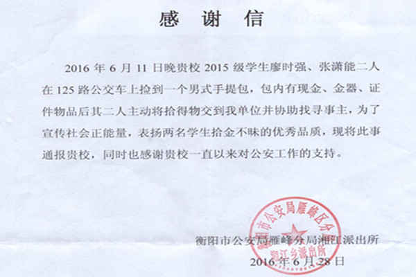 2016年6月11日晚,贵校2015级学生廖时强、张潇能二人在125路公交车上捡到一个男士手提包,包内有现金、金器、证件等物品,二人主动将拾得物交到我单位并协助找寻事主。为了宣传社会正能量,表扬两名学生拾金不昧的优秀品质,现将此事通报贵校,同时也感谢贵校一直以来对公安工作的支持。