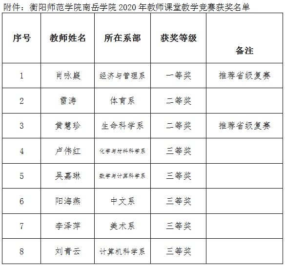 根据湖南省教育厅《关于举办2020年湖南省普通高校教师课堂教学竞赛的通知》(湘教通〔2020〕139号)和学院《关于组织开展2020年院级教师课堂教学竞赛工作的通知》(衡师南岳教通[2020]10号)文件精神,学院组织开展了教师课堂教学竞赛活动。经各教学部门评选推荐,教学办审核,学院专家组听课打分,共有8名教师获奖,其中一等奖1名,二等奖2名,三等奖5名。根据得分排名并结合省级文件精神,拟推荐经济与管理系肖咏嶷和生命科学系黄慧珍2名教师参加湖南省普通高校教师课堂教学竞赛。具体获奖名单见附件。现予以公示,公示期为三天。